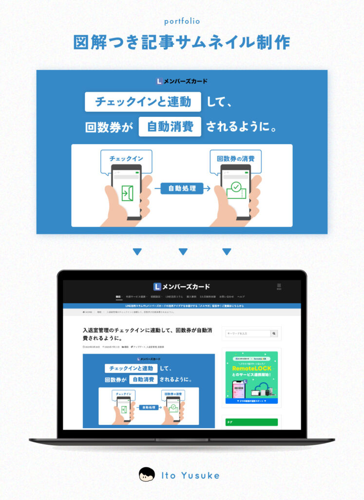 BtoB向けSaaSメディア「Lメンバーズカード」記事用のサムネイルを制作させていただきました。「チェックインと連動して回数券が自動消費される仕組み」を、“アイコン+流れ図”で直感的に理解できるよう図解化しています。