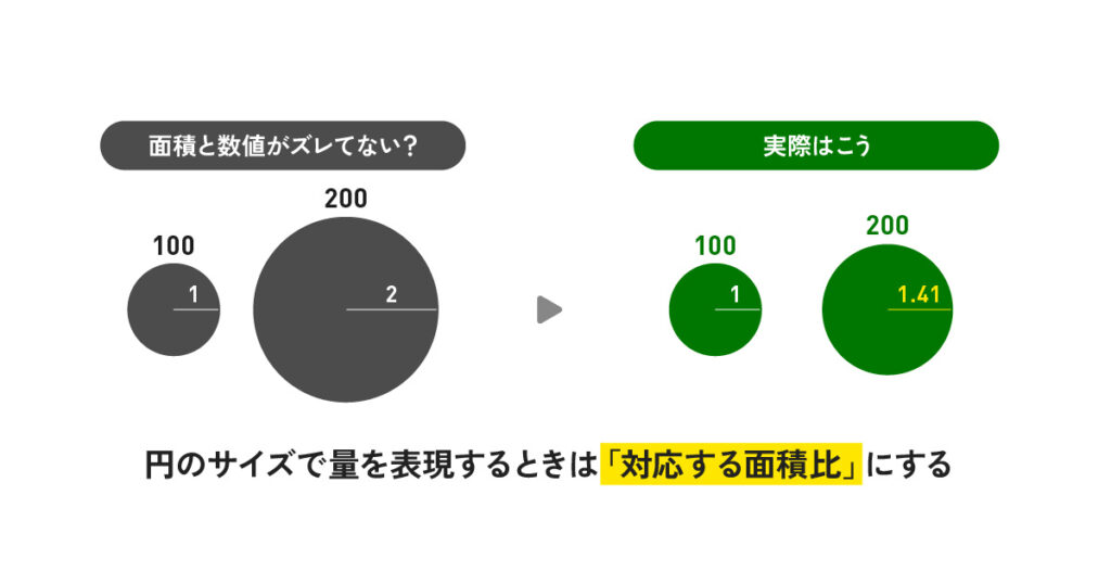 例えば「A=100」「B=200」というデータを円で表すとき、Bの半径をAの2倍にすると、面積は4倍になってしまいます。