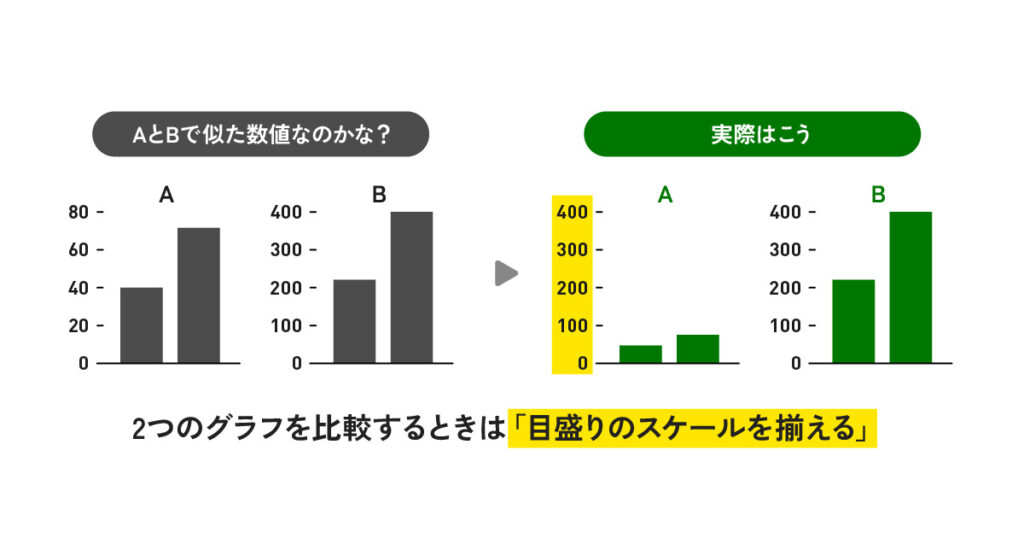 Aのグラフが0〜100、Bが0〜400で描かれていたら、Aの変化が大きく見えたり、Bが過剰に安定して見えたりすることも。