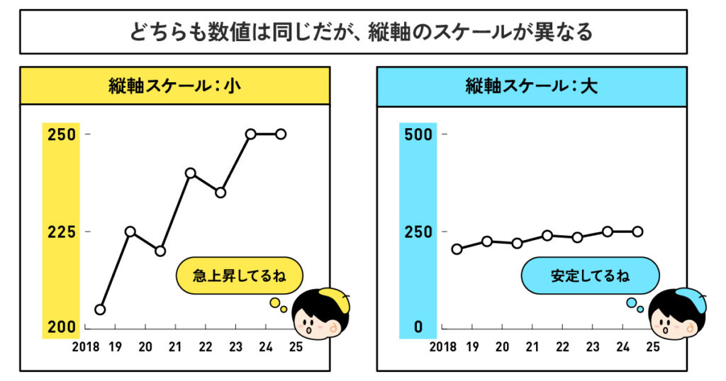 同じデータでも、縦軸・横軸のスケール次第で「伸びて見える」「下がって見える」といった錯覚が生まれるんです。