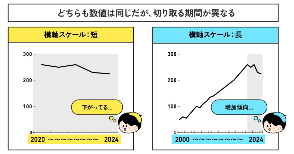 同じデータでも、どの範囲を見せるかによって結論が変わることがあるんです。