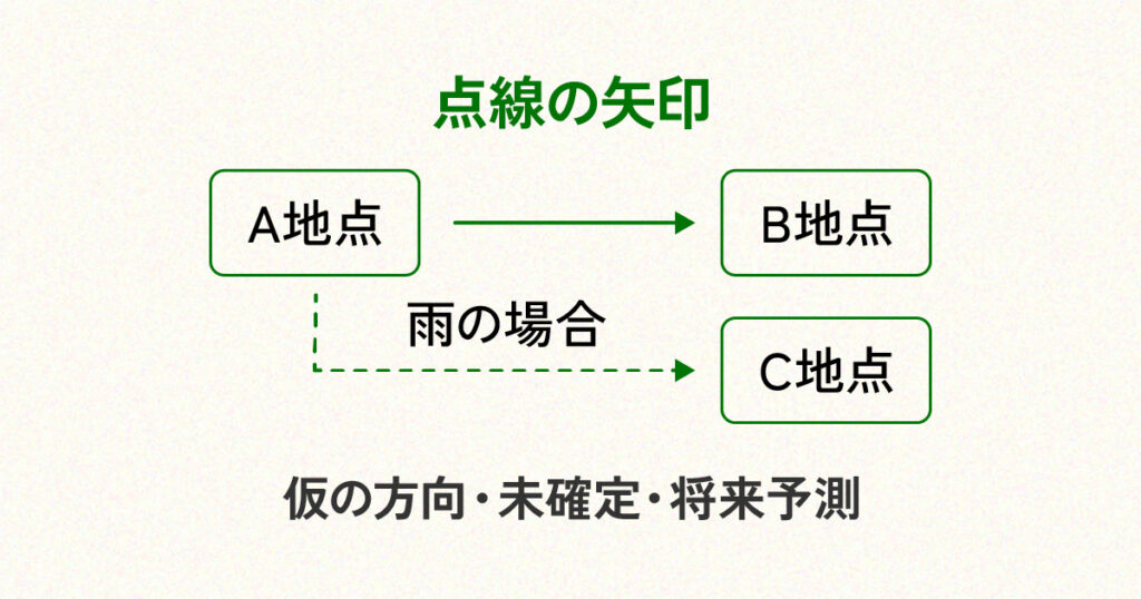 たとえば「太い矢印」と「点線の矢印」では、見る人が受け取る印象はまったく違います。前者は“確定した流れ”を示すのに対して、後者は“仮のルート”や“未確定な関係”を示すもの。