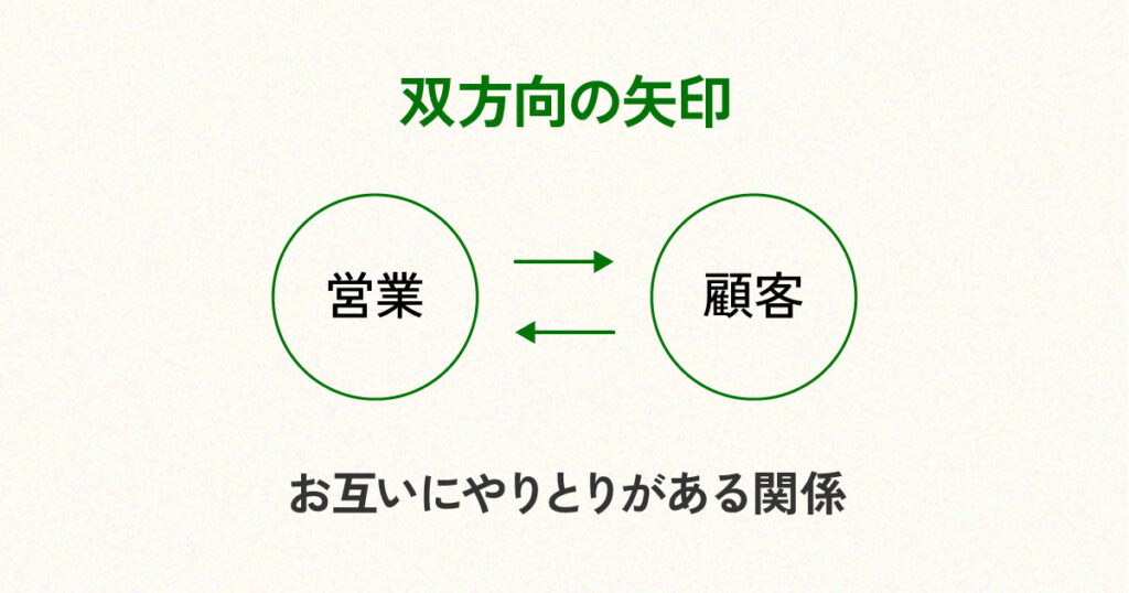 たとえば「営業 ↔ 顧客」という関係を描くと、双方向のコミュニケーションや取引の往来が伝わります。
