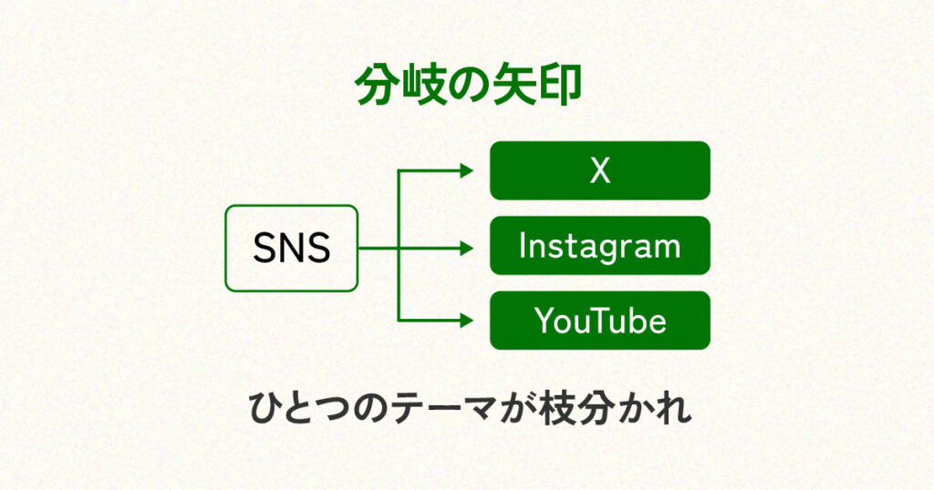 「SNS → X/Instagram/YouTube」といったように、ひとつの要素が複数に分かれる場面では分岐の矢印が活躍します。