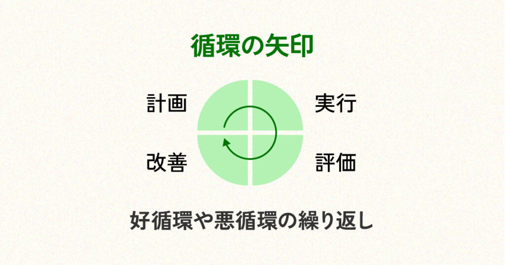「計画 → 実行 → 評価 → 改善 → 計画…」のように、ループ状に続く流れは循環の矢印で表すと分かりやすいです。