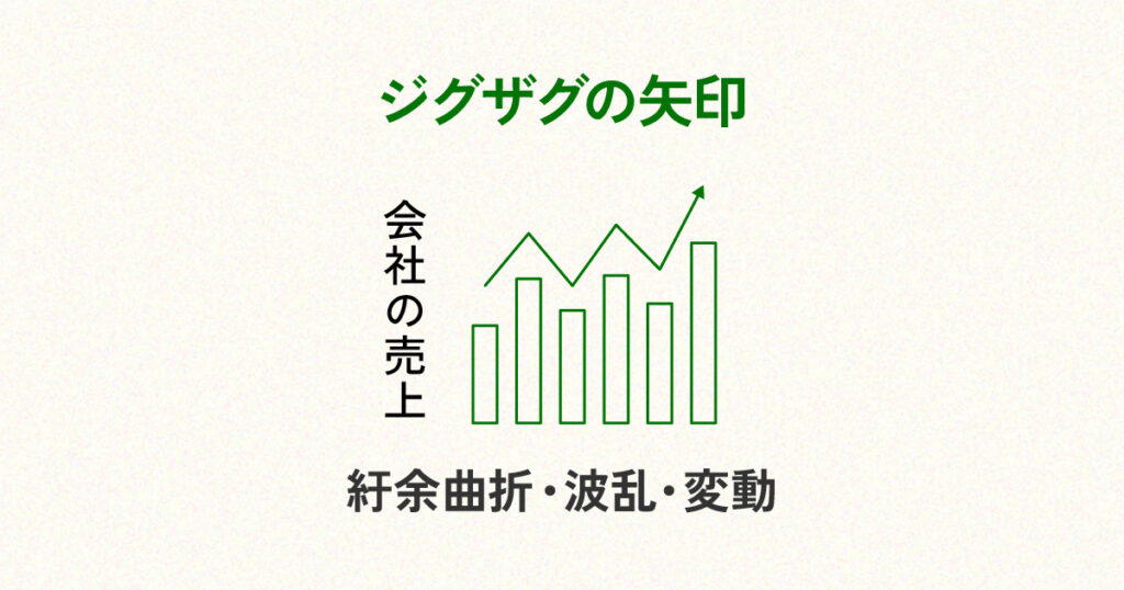 折れ線やジグザグの矢印は、変動・波乱・アップダウンを示すときに使います。