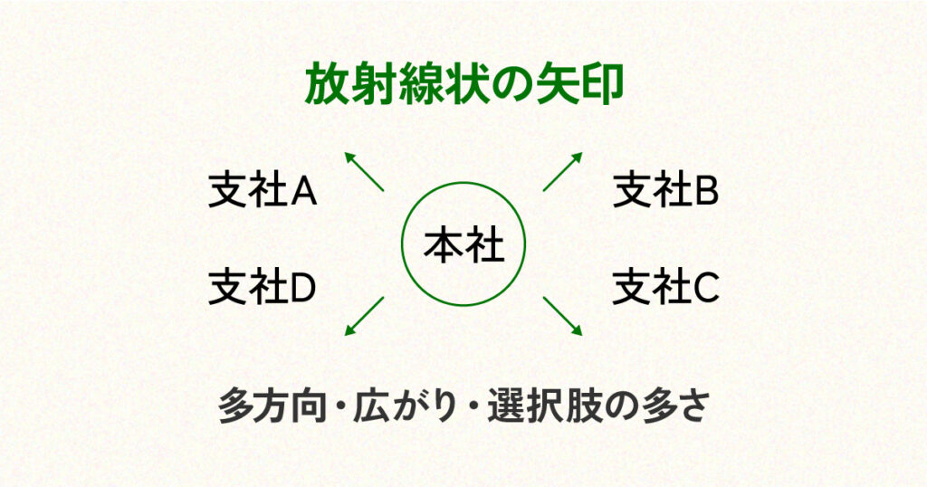中心から外へ向かう放射線状の矢印は、広がり・多方向性・選択肢の多さを表します。