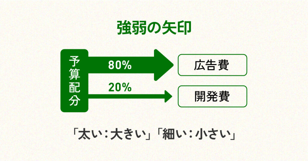 たとえば「予算配分:広告費80% → 開発費20%」という図では、太い矢印を広告費に使うことで優先度や重みが一目で伝わります。