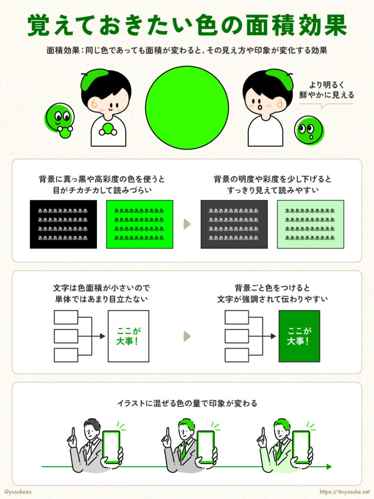 中でも、今回の図解のテーマである「色の面積効果」は、知っておくだけでグッと伝わりやすさが上がる超・実践的な考え方です。