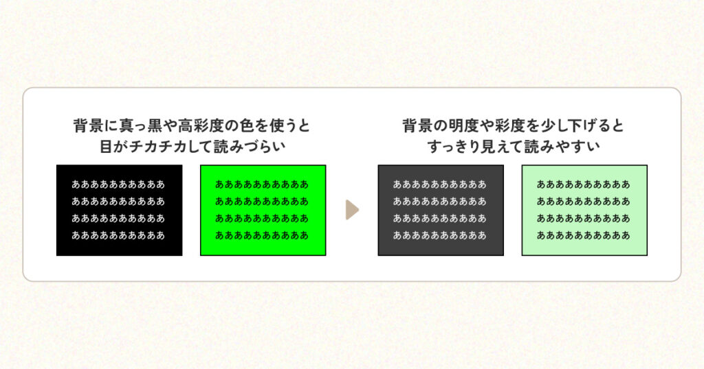 背景に真っ黒や高彩度の色を敷いてしまうと、どうしても文字が読みにくくなります。