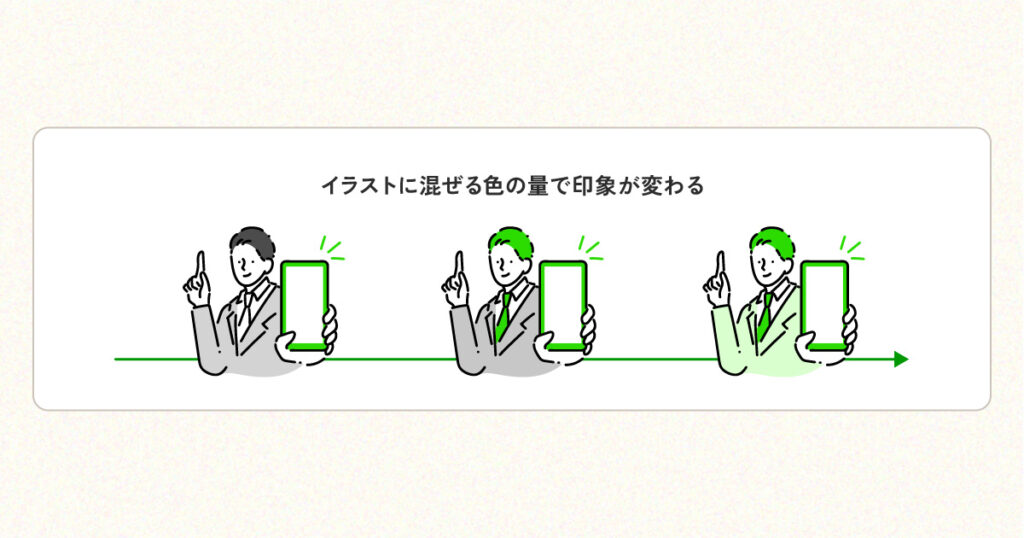 図解の最後の例のように、人物イラストに混ぜる色の量を変えるだけで、印象は大きく変わります。