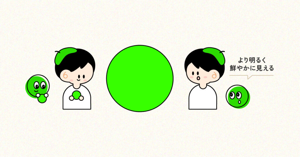 たとえば、小さな丸で見る緑と、画面いっぱいに広がった緑では、同じ色でもまったく違って見えます。