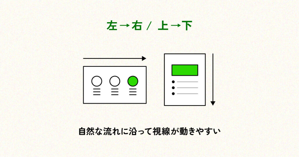 日本語の資料では、視線は基本的に「左から右」「上から下」へ流れます。これは文章を読む際の習慣によるもので、多くの資料デザインの前提となる考え方です。