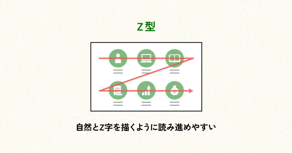 Z型は、Webサイトやカード型レイアウトなどでよく使われる視線の動きです。