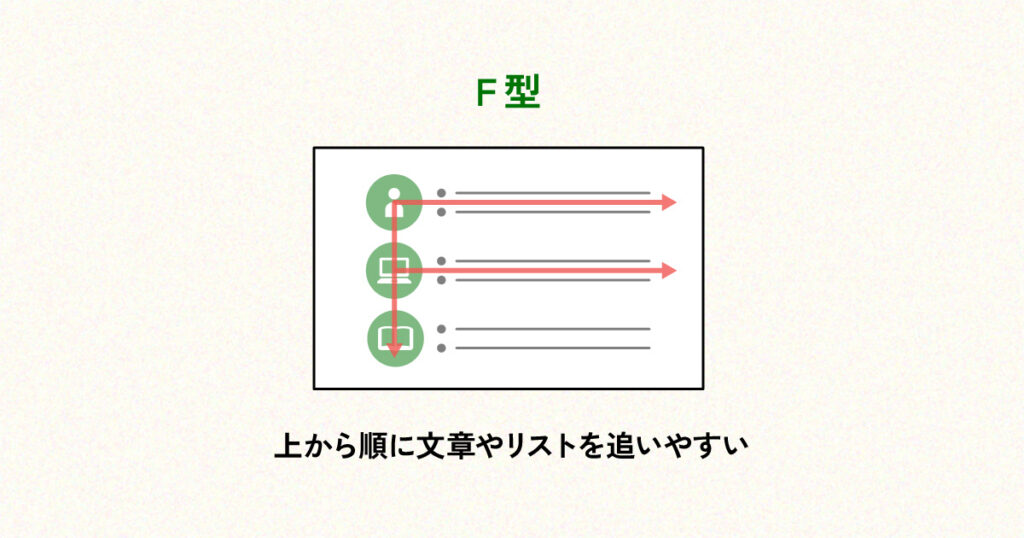 文章や箇条書きが中心の資料では、F型の視線誘導が効果的です。
