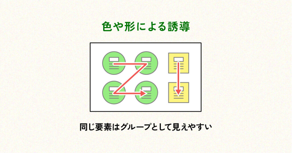 視線誘導は、矢印や配置だけでなく、色や形によっても行えます。