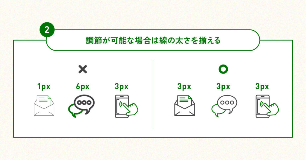 特にアウトライン系のアイコンでは、線の太さは統一感のカギです。