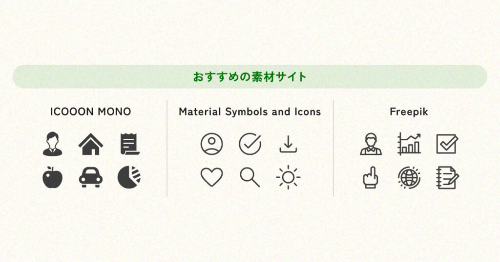 同じサイトで提供されているアイコンは、線の太さ・角の処理・比率やサイズ感などが揃っているので、統一感を出しやすくなります。