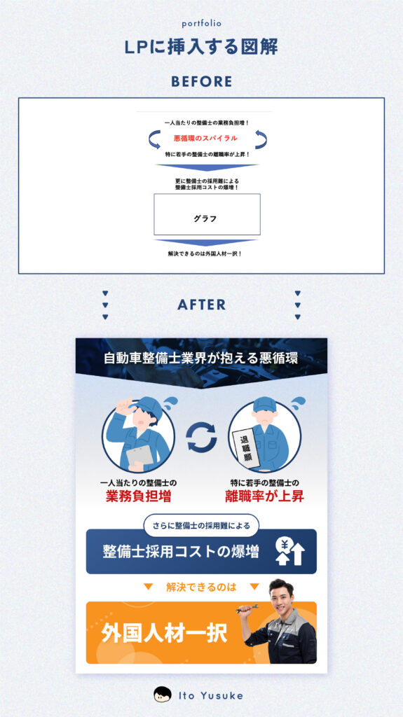 元の資料では文章と簡易的な矢印だけで説明されていたため、内容は伝わるものの直感的な理解には少しハードルがありました。そこで、業界の課題である「悪循環の流れ」をイラストを交えてビジュアル化。